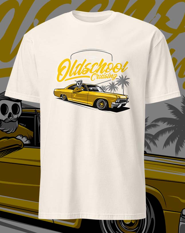 The Oldschool Cruise tee brings the golden era of lowriders back to life. Featuring a bold yellow classic ride, palm trees, and vintage-style typography, this design captures that laid-back, SoCal-inspired nostalgia.