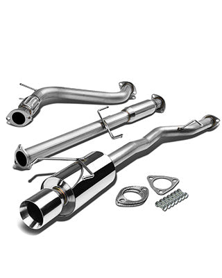 High-quality T-304 stainless steel construction, CNC flanges with TIG welds, 2.25” inlet and main piping, 4” double-wall muffler tip (101.6 mm), round canister design, aggressive tone, bolt-on for Accord CD, increased performance and response.