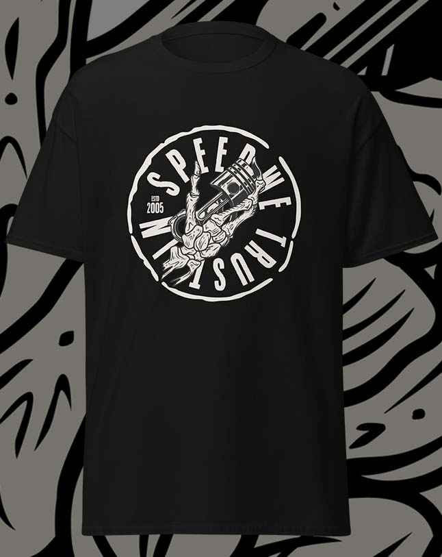 The Speed We Trust Tee is made for gearheads who live by the throttle. Featuring a bold piston-in-hand design wrapped in a raw circular logo, this backprint speaks loud in the pitlane, at the meet, or on the street. Whether you're wrenching all day or sending it flat out, this shirt is built for your rhythm.