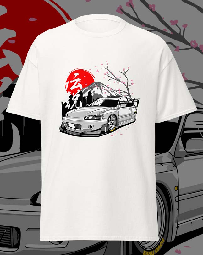 Backprint with red sun, mountains, sakura, and JDM coupe